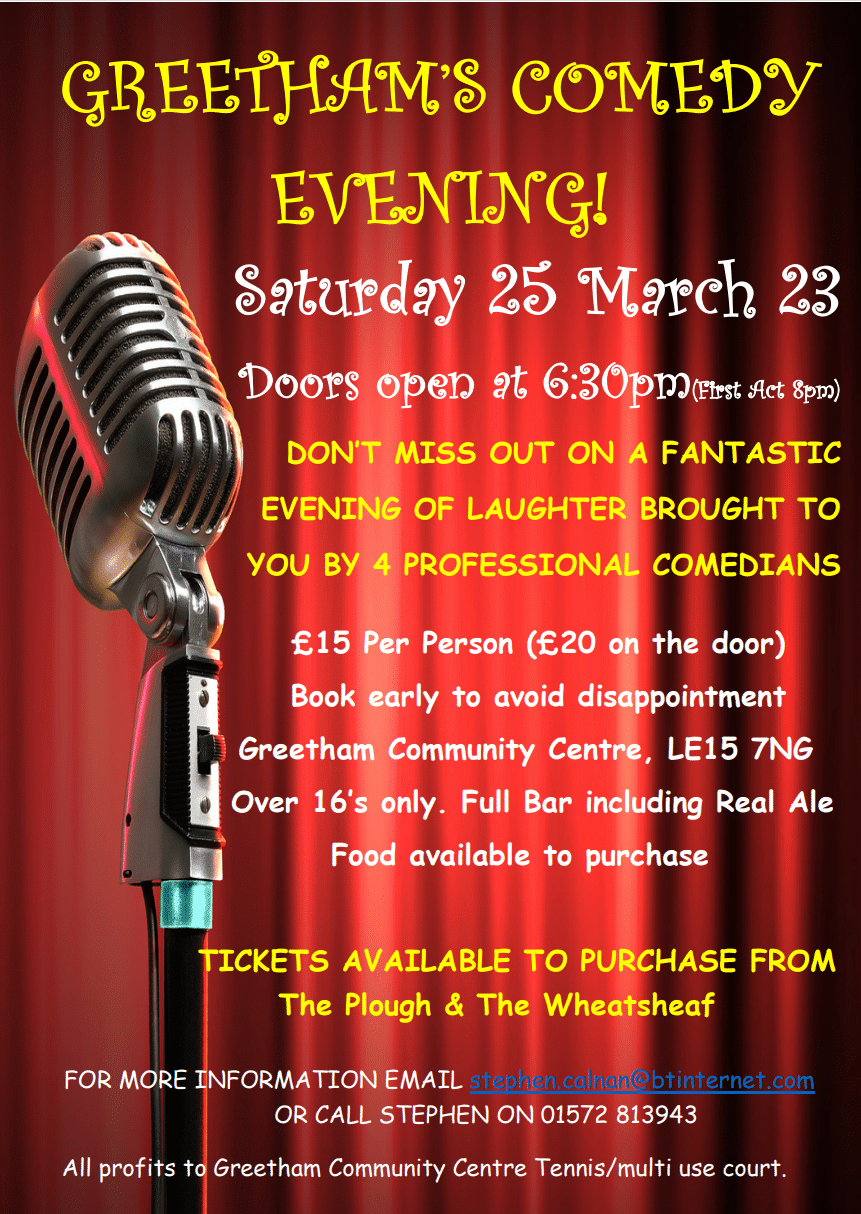 Greetham’s Comedy Evening – Saturday 25th March 2023 – Doors Open at 6.30pm